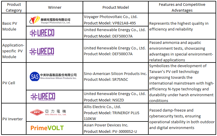 Amidst rigorous testing,we proudly congratulate the following companies and their products for successfully passing the evaluation to become this year’s Taiwan Excellent PV Award winners: