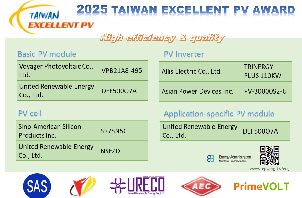 In the global pursuit of net-zero emissions and the transition to renewable energy,photovoltaic(PV)technology has become a cornerstone of Taiwan’s green economy.To motivate domestic companies to continually advance and produce high-value products,while enhancing the international competitiveness and image of Taiwan's PV products with respect to quality,the Energy Administration under the Ministry of Economic Affairs established the prestigious Taiwan Excellent PV Award in 2013.This highest industry honor represents the pinnacle of Taiwan’s PV standards and guarantees exceptional quality,efficiency,and long-term reliability.